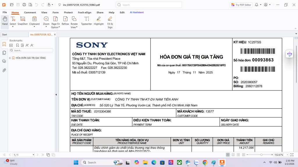 Vào danh sách hóa đơn đầu vào, tìm đến hóa đơn của SONY.