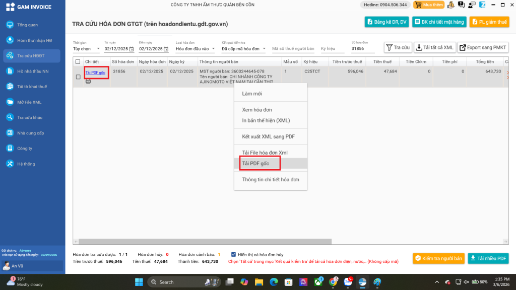 B1: Mở phần mềm quản lý hóa đơn của bạn (GAM INVOICE). Vào danh sách hóa đơn đầu vào, tìm đến hóa đơn của Ajinomoto.