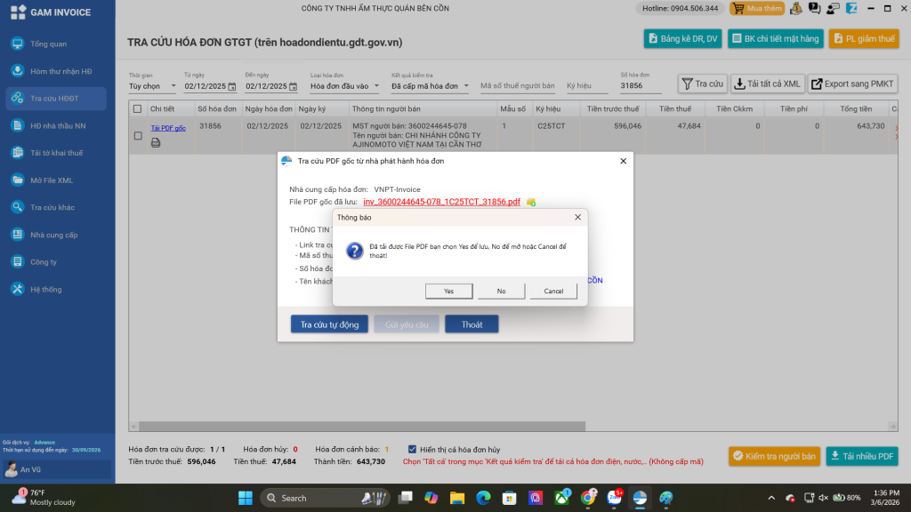 B4: Chờ trong giây lát hóa đơn sẽ được tải về và hỏi bạn có muộn lưu hay muốn xem. Bạn có thể chọn Yes để lưu lại hóa đơn, hoặc chọn No để xem hóa đơn.