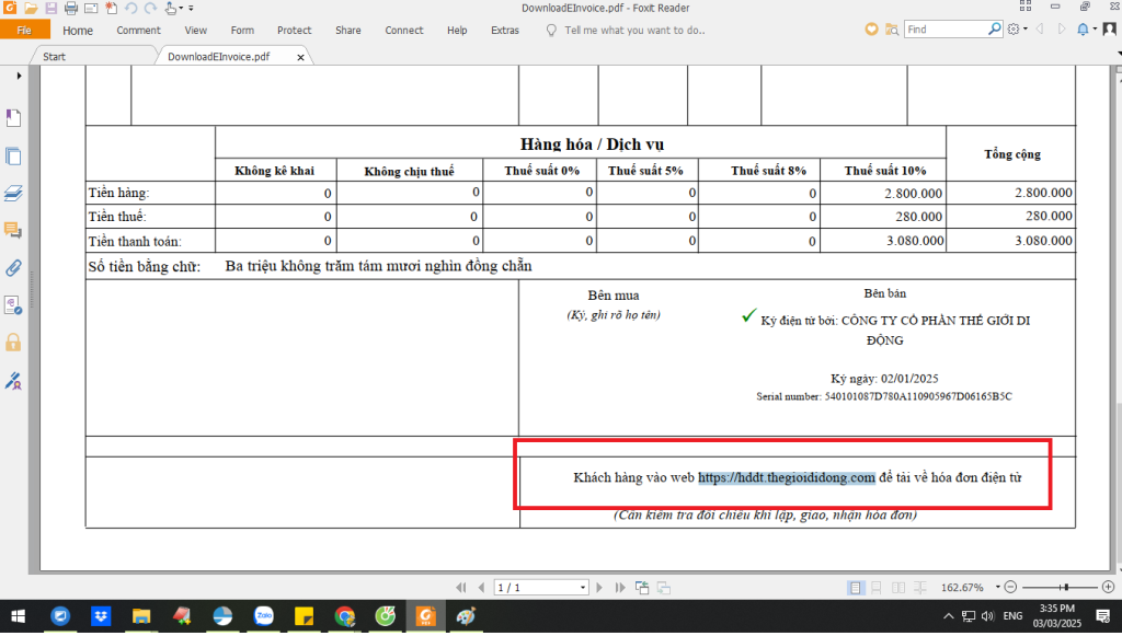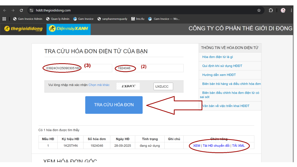 Thông thường, để tra cứu được File PDF của TGDĐ, bạn phải có email, trong email sẽ cung cấp cho chúng ta đường link và mã tra cứu. Thường thì đường link sẽ là: https://hddt.thegioididong.com và khi đó thì rất dễ dàng chúng ta có thể tải hóa đơn về với các thông đã được cung cấp.