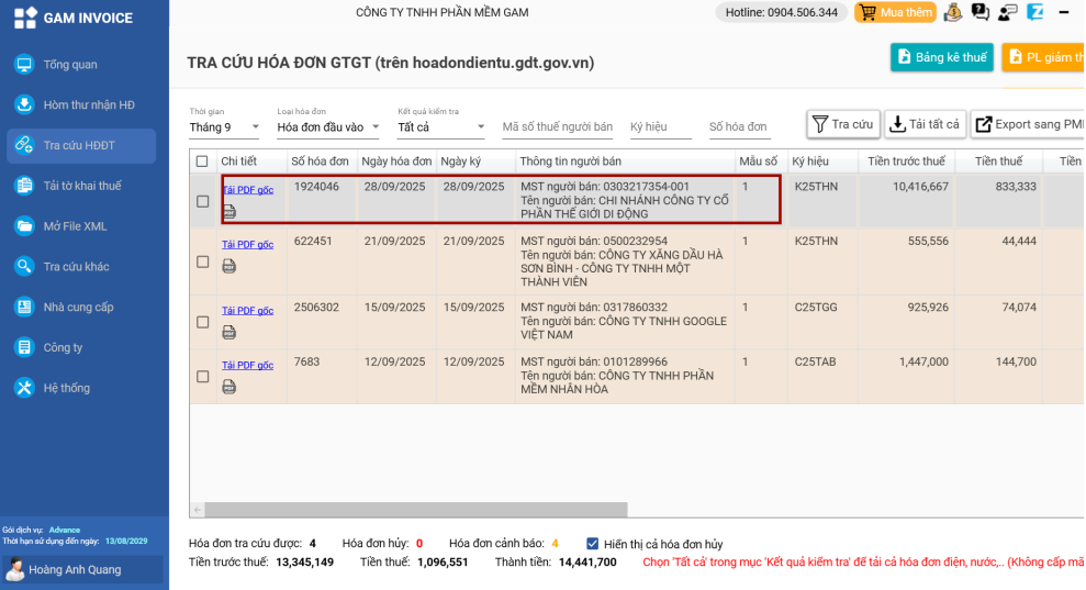 Đầu tiên các bạn cần tra cứu danh sách hóa đơn đầu vào của công ty mình. Tại danh sách này bạn nhấp chọn tới hóa đơn Điện Máy Xanh cần tải PDF.