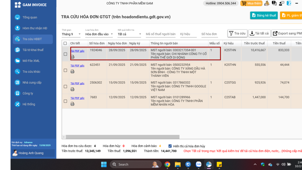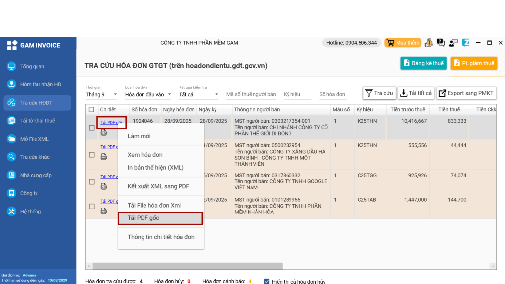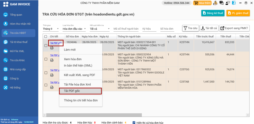 Đây là phần mềm quản lý hóa đơn GAM INVOICE. Bạn có thể tải, cài đặt và sử dụng full tính năng miễn phí 1 tháng. Hết thời gian trên, để dùng tiếp bạn chỉ phải trả phí 699 nghìn / 1 năm, và chỉ với 699 nghìn, bạn có thể dùng được 3 công ty và không giới hạn số lượng hóa đơn.