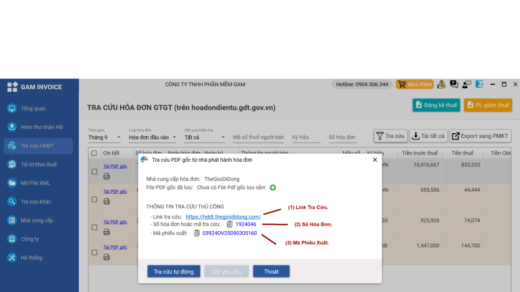 Bạn dán nội dung vừa copy vào ô đầu tiên được đánh số 3 trên màn hình, chính là thông tin phiếu xuất. Tiếp tục trở lại màn hình thông tin tra cứu Copy Số hóa đơn rồi dán vào mục đánh số (2) số hóa đơn trên màn hình tra cứu của trang TGDĐ, sau đó chọn <Tra cứu hóa đơn>.