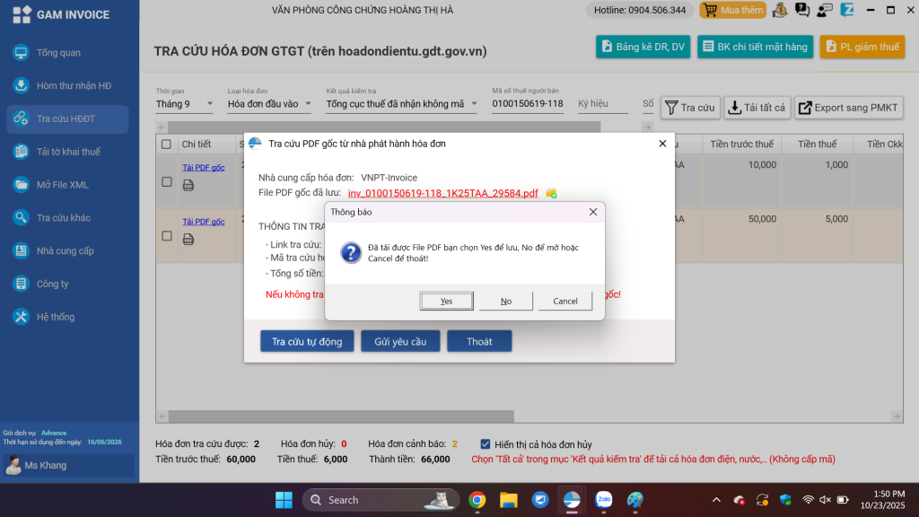 B4: Chờ trong giây lát hóa đơn sẽ được tải về và hỏi bạn có muộn lưu hay muốn xem. Bạn có thể chọn Yes để lưu lại hóa đơn, hoặc chọn No để xem hóa đơn.