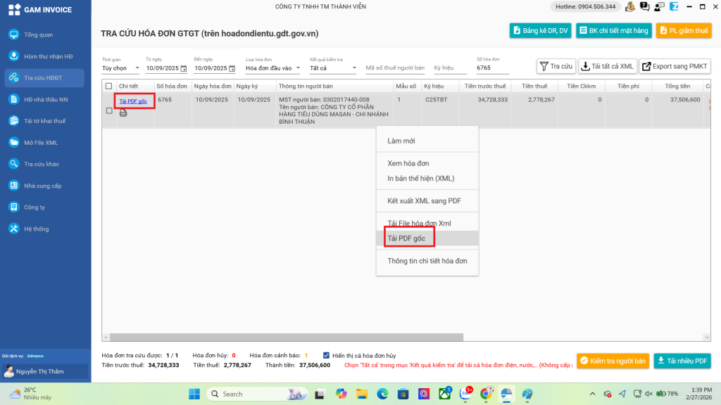 Vào danh sách hóa đơn đầu vào, tìm đến hóa đơn hàng tiêu dùng MASAN.
