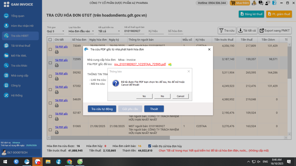 Chờ trong giây lát hóa đơn sẽ được tải về và hỏi bạn có muộn lưu hay muốn xem. Bạn có thể chọn Yes để lưu lại hóa đơn, hoặc chọn No để xem hóa đơn.