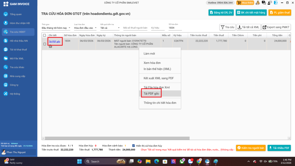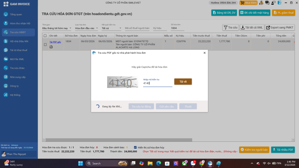 Chính là GAM INVOICE – phần mềm chuyên dụng giúp bạn tải hóa đơn từ nhiều nhà cung cấp lớn như Lotte, đăng kiểm, giao hàng nhanh, xăng dầu,… Cài dùng thử 1 tháng miễn phí, sau đó chỉ 699k/năm cho 3 công ty.