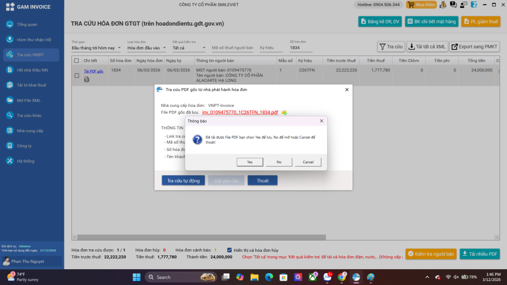 B4: Chờ trong giây lát hóa đơn sẽ được tải về và hỏi bạn có muộn lưu hay muốn xem. Bạn có thể chọn Yes để lưu lại hóa đơn, hoặc chọn No để xem hóa đơn.