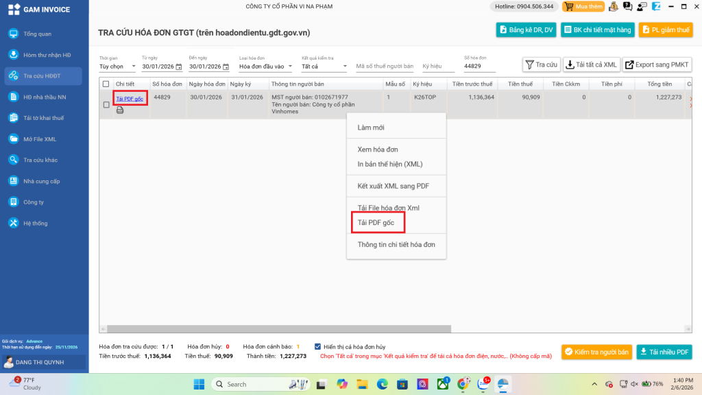 Vào danh sách hóa đơn đầu vào, tìm đến hóa đơn phí dịch vụ VINHOMES.