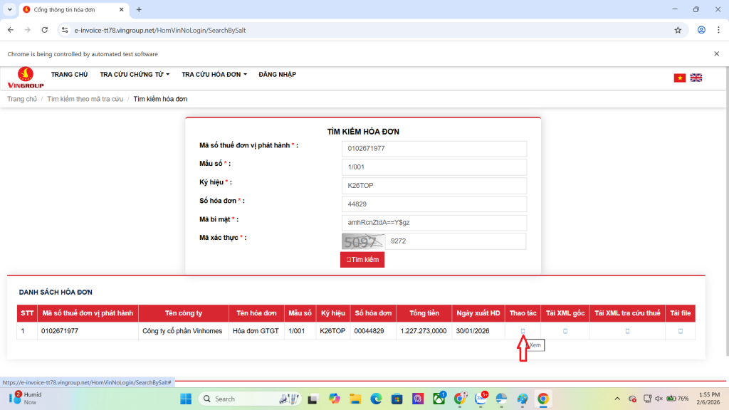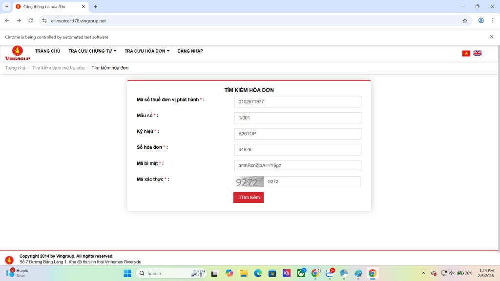 B3: Chờ trong giây lát trang tải hóa đơn sẽ được được xuất hiện trên màn hình và tự động điền thông tin cho bạn. Lúc này bạn chỉ cần điền <Mã xác thực> rồi nhấn nút Tìm kiếm.