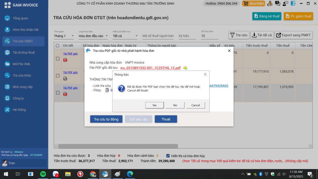 Chờ trong giây lát hóa đơn sẽ được tải về như hình dưới đây, bạn có thể chọn Yes để lưu hóa đơn về máy, hoặc chọn No để xem hóa đơn.