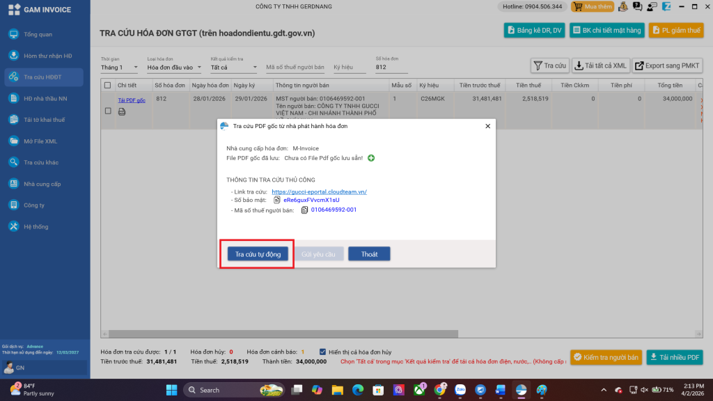 B3: Sau khi bấm tải PDF gốc, bạn hãy bấm <Tra cứu tự động> trong hộp thoại.