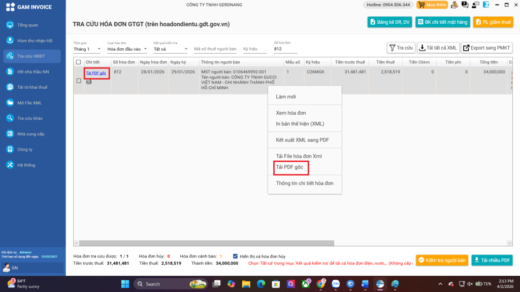 B1: Mở phần mềm quản lý hóa đơn của bạn (GAM INVOICE). Vào danh sách hóa đơn đầu vào, tìm đến hóa đơn của nhà phân phối sản phẩm thương hiệu Gucci.