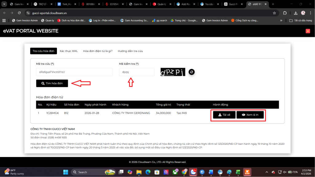 Trên mỗi hóa đơn PDF của nhà cung cấp này, ở phần cuối luôn có chú thích dẫn tới trang tra cứu cụ thể là https://gucci-eportal.cloudteam.vn/. Tuy nhiên, nếu bạn không nhận được email, thì cũng không sao. Chúng tôi sẽ chỉ bạn cách khác nhanh gọn hơn.