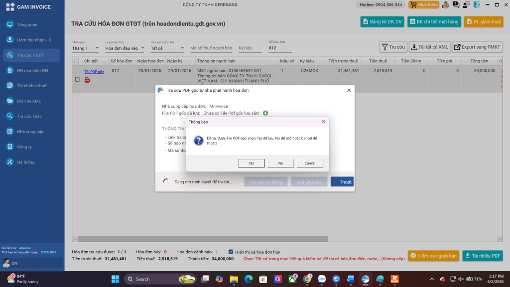 B5: Sau đó bạn quay về phần mềm chờ trong giây lát hóa đơn sẽ được tải về và hỏi bạn có muộn lưu hay muốn xem. Bạn có thể chọn Yes để lưu lại hóa đơn, hoặc chọn No để xem hóa đơn.